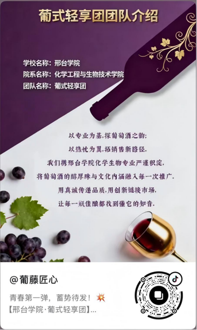 “青春第一彈 蓄勢待發!”邢臺學院化學工程與生物技術學院的葡式輕享團在抖音分享了參賽的心情,打出了“以專業為基 探葡萄酒之韻;以熱忱為翼,拓銷售新路徑”的口號,將攜專業優勢和積淀,將葡萄酒的醇厚味道與文化內涵融入每一次推廣,用真誠傳遞品質,用創新鏈接市場。