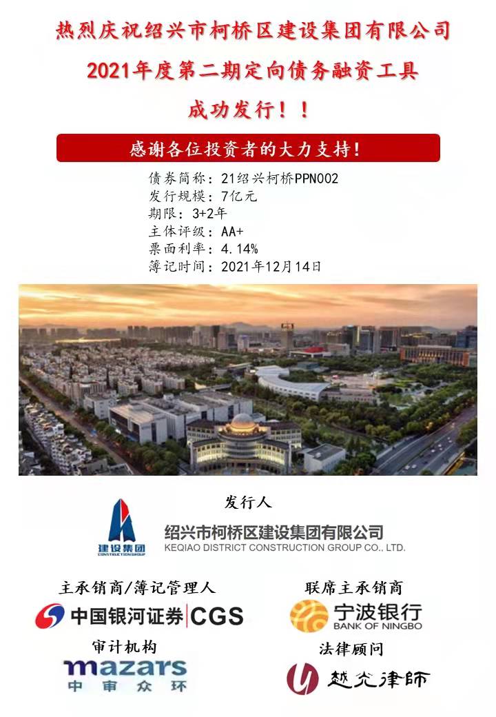 1214日,紹興市柯橋區(qū)建設(shè)集團(tuán)有限公司2021年第二期定向債務(wù)融資工具成功簿記建檔,規(guī)模7億元,期限3+2年,AA+主體無(wú)擔(dān)保,票面利率4.14%。