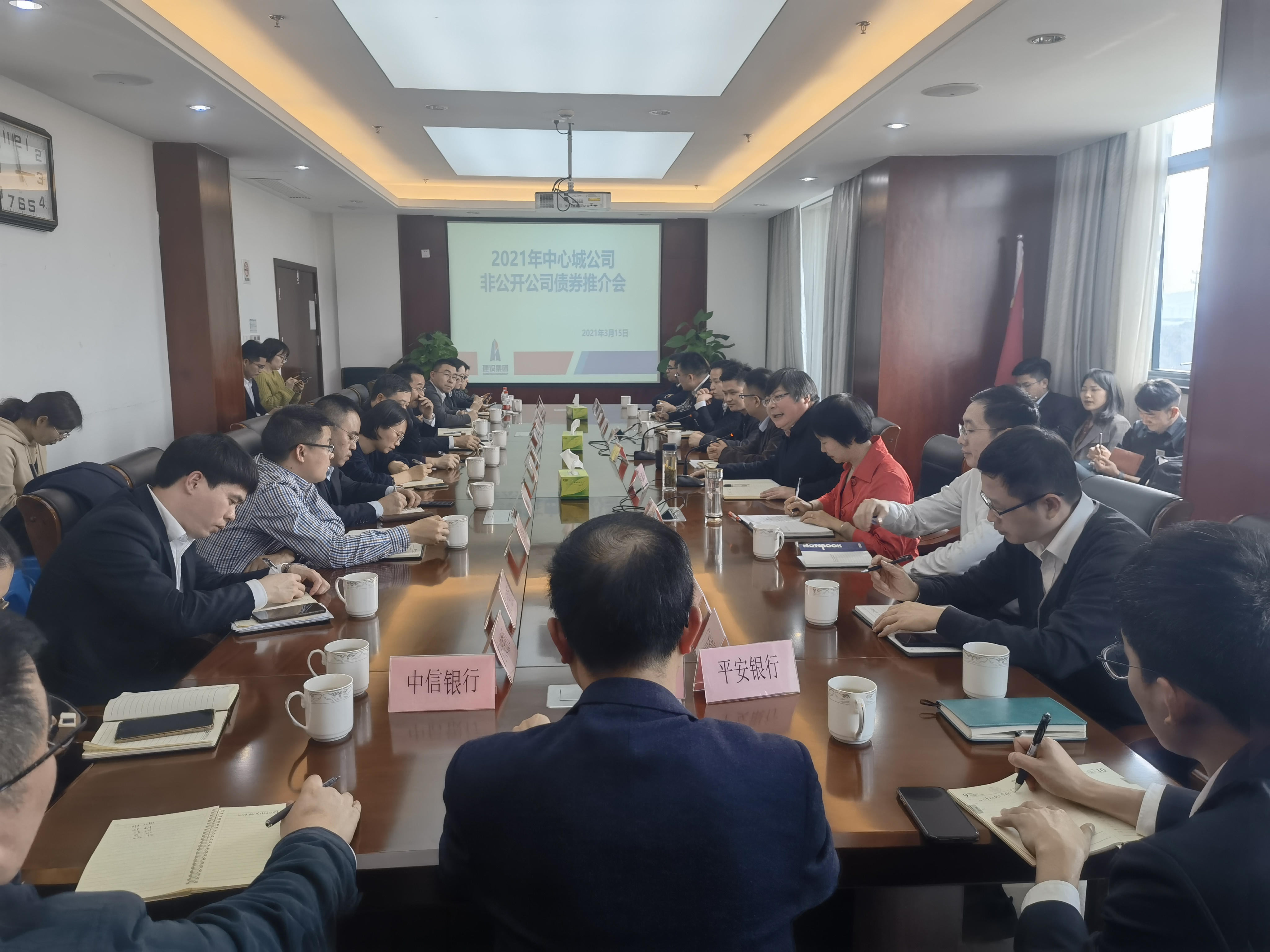 3月15日下午,區(qū)建設(shè)集團(tuán)召開中心城公司2021年非公開公司債券推介會。集團(tuán)總經(jīng)理施林濤、副總經(jīng)理包震東、浙商證券投行經(jīng)理?xiàng)钗纳肮ぁ⑥r(nóng)、中、建等21家銀行、浙商證券項(xiàng)目組和集團(tuán)融資部共40余人參加會議。
