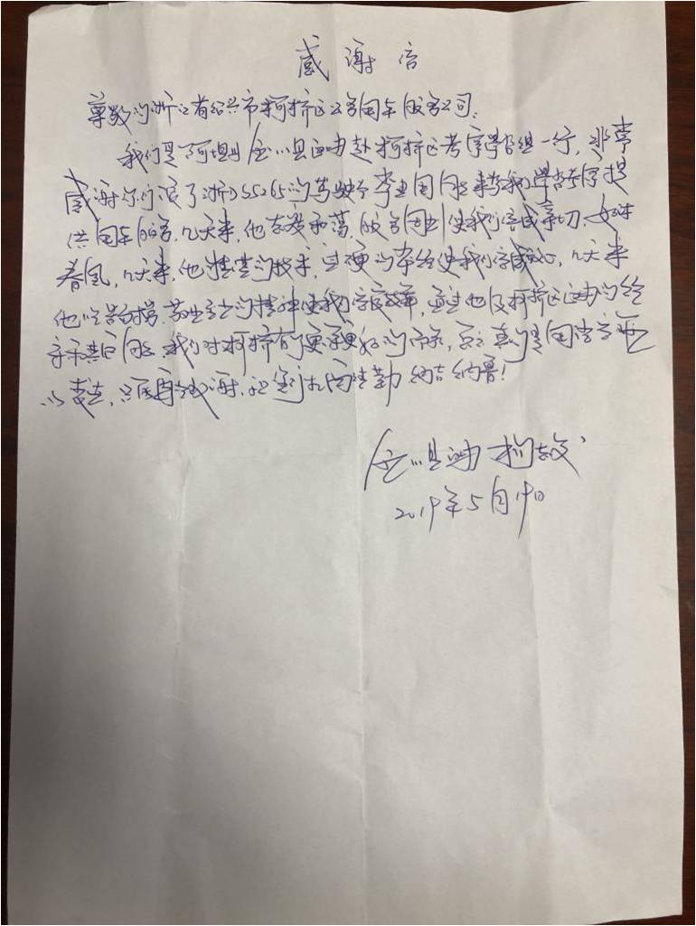 5月19日,區(qū)公車公司收到一封來自四川省阿壩州金川縣的感謝信。來信中,金川縣赴我區(qū)考察學(xué)習(xí)組一行由衷感謝了公司浙DS5265車的駕駛員李建國同志在履行出車任務(wù)期間待人和藹、愛崗敬業(yè),以精湛的駕駛技術(shù)和吃苦耐勞的工作態(tài)度,使考察組一行倍感親切、如沐春風(fēng),提高了考察組一行的辦事效率,對我區(qū)有了更深更好的認(rèn)識,并送出無恙族祝福語:納吉納魯。